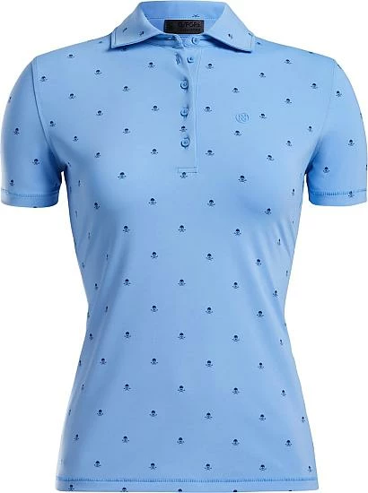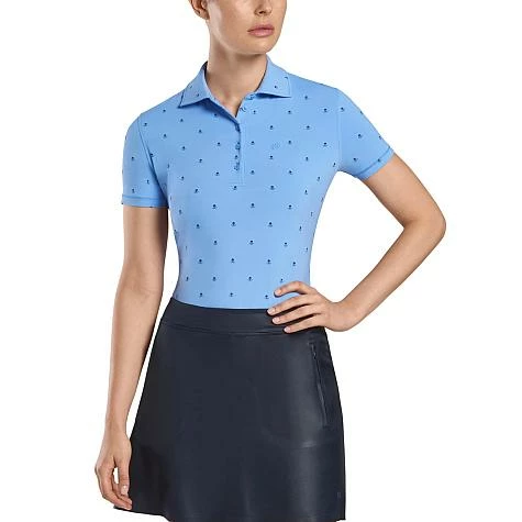 G/Fore Women’s Killer T’s Printed Golf Shirts 81% Nylon, 19% Spandex, five-button placket, UV protection, self collar, and Skull and T’s logo printed allover.