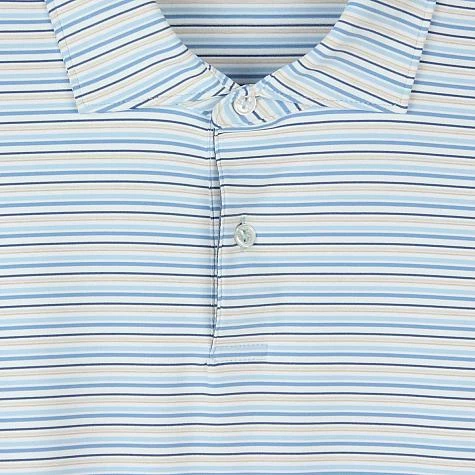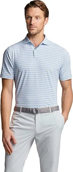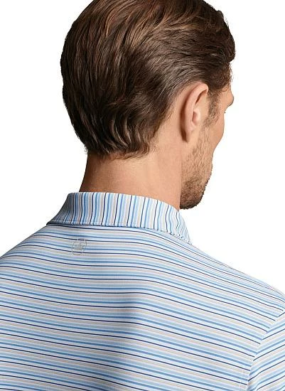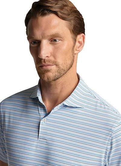Peter Millar Crown Crafted Casely Performance Jersey Golf Shirts are constructed with 92% Polyester, 8% Spandex, self collar, two-button placket, a multicolor stripe print, and four-way stretch capabilities.