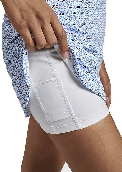 Peter Millar Women’s Performance Alice Petal Hem Mosaic Golf Skorts feature a convenient control shortie with compression paneling for strategic body shaping.