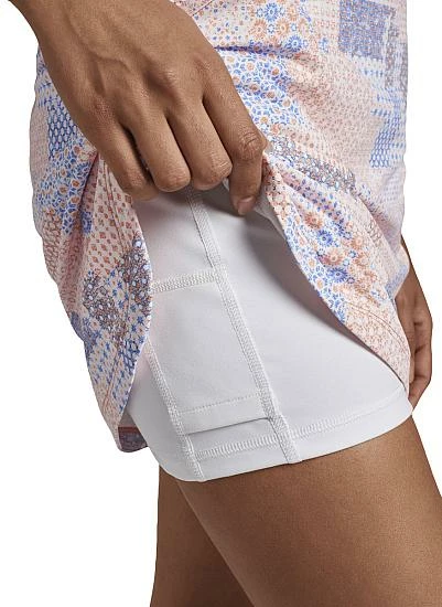 Peter Millar Women’s Performance Alice Petal Hem Patchwork Golf Skorts feature a convenient control shortie with compression paneling for strategic body shaping.