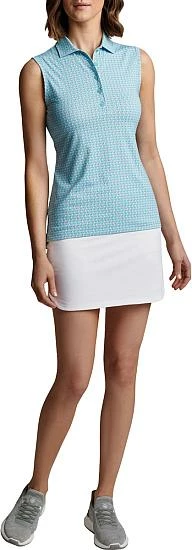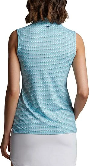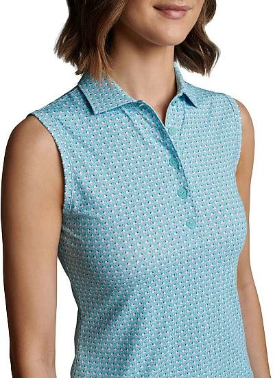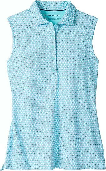Peter Millar Women’s Performance Sleeveless Golf Shirts are constructed with 92% Polyester, 8% Spandex, five-button placket, self collar, flared hem, and subtle novelty print.