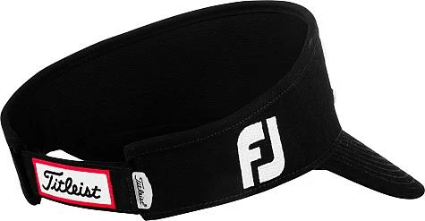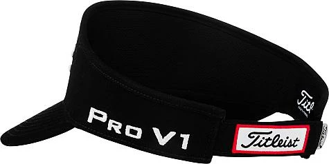 The front of these golf visors has the embroidered Titleist script logo, the left side features embroidered Pro V1 and FootJoy logos and the back has a Titleist patch logo on the back closure.