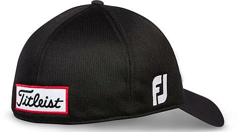 These golf hats are designed with the Titleist script logo across the front, the Titleist patch logo above the back opening, the FootJoy FJ logo on the wearer’s right side, and the Pro V1 logo on the wearer’s left side.